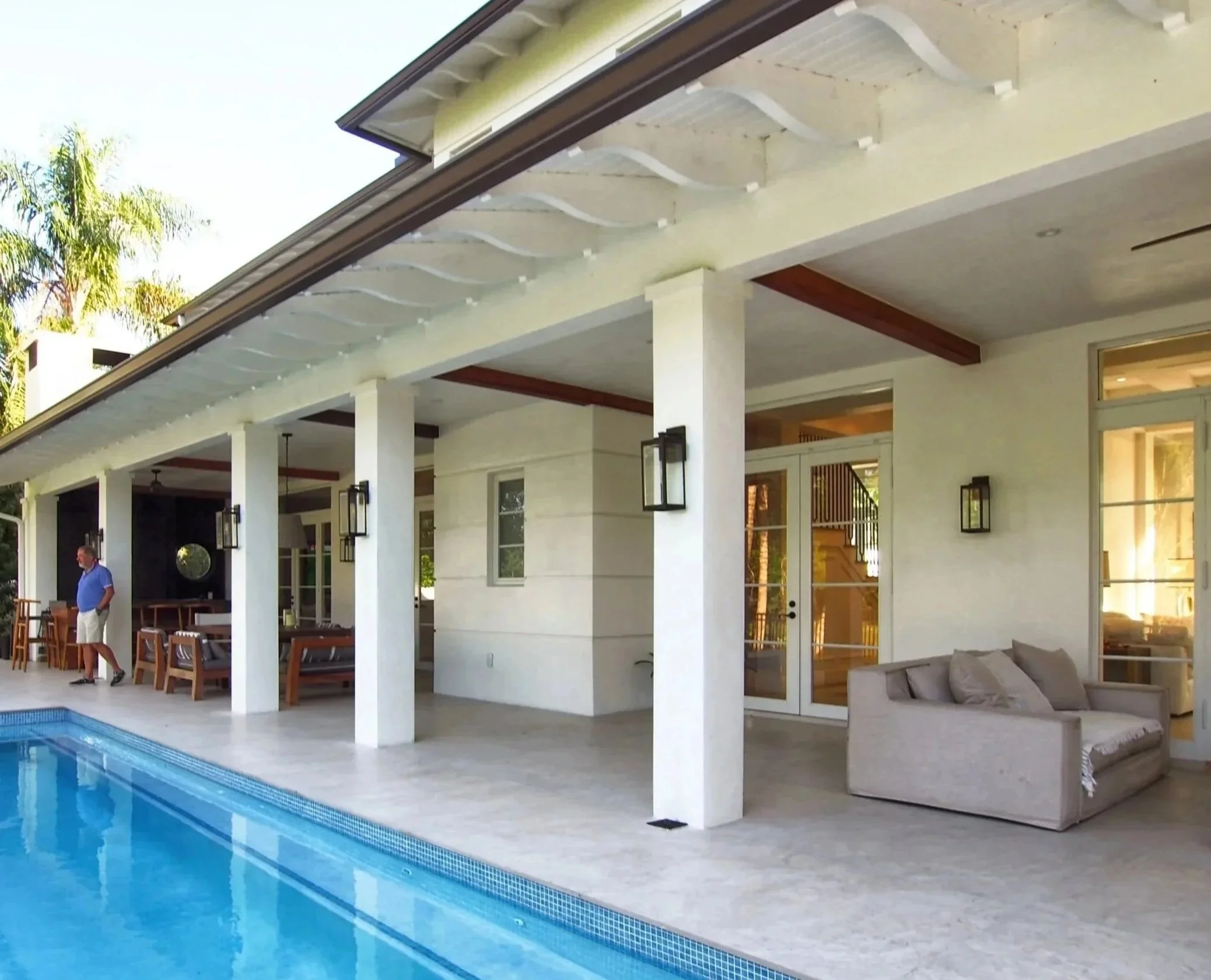 The deck expands outwards from the gallery and incorporates a swimming pool and sundeck.