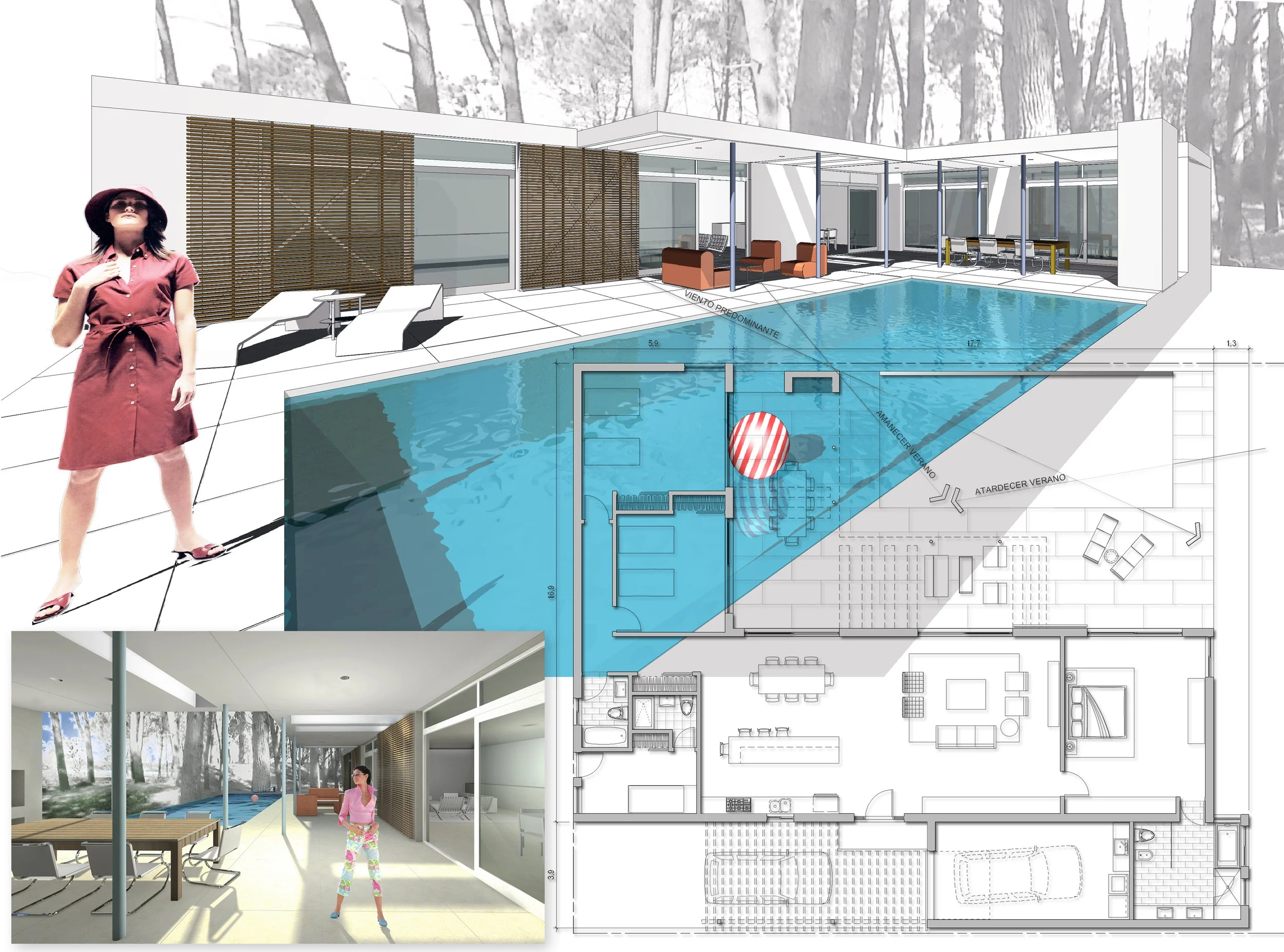 The building is resolved with a rational layout to minimize costs, opening up to a pool courtyard. The pergola provides dining and lounging areas sheltered from the predominant winds.